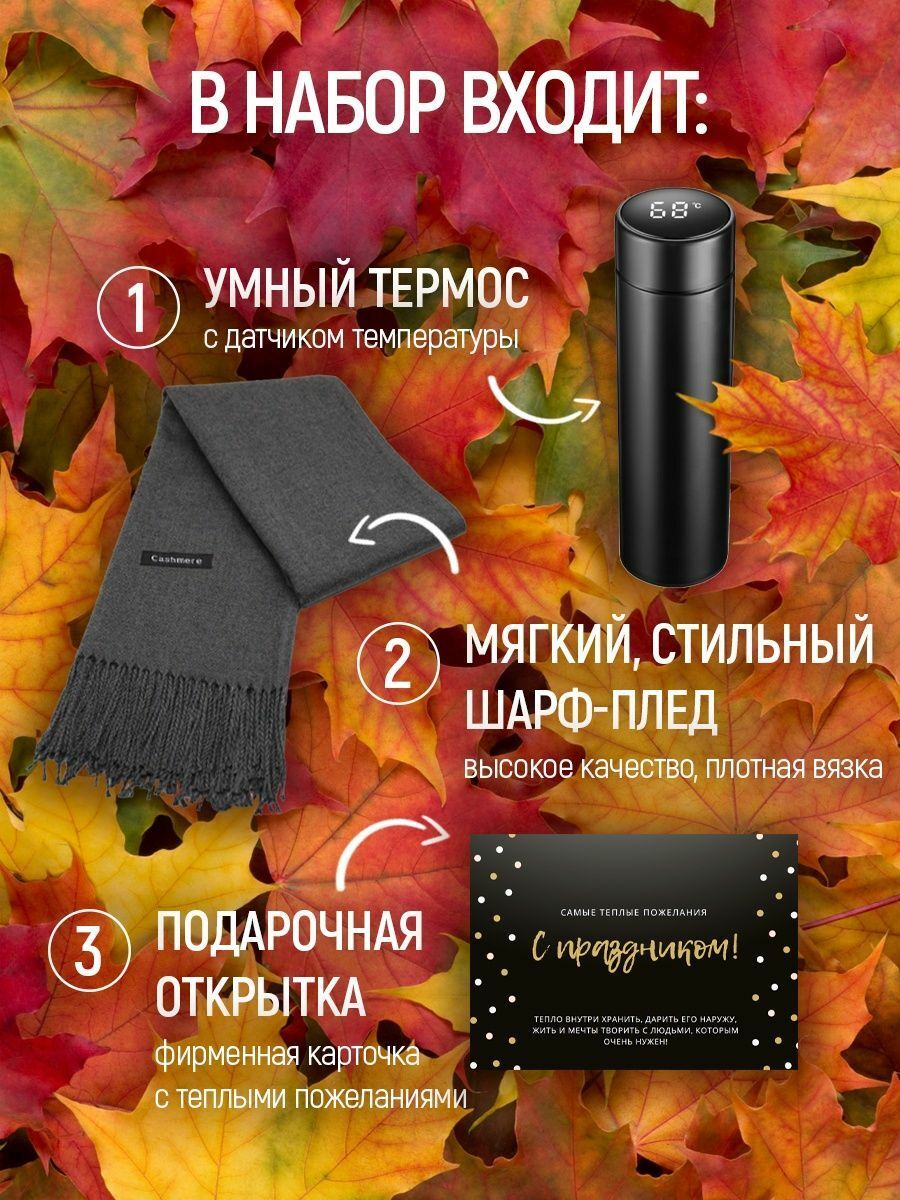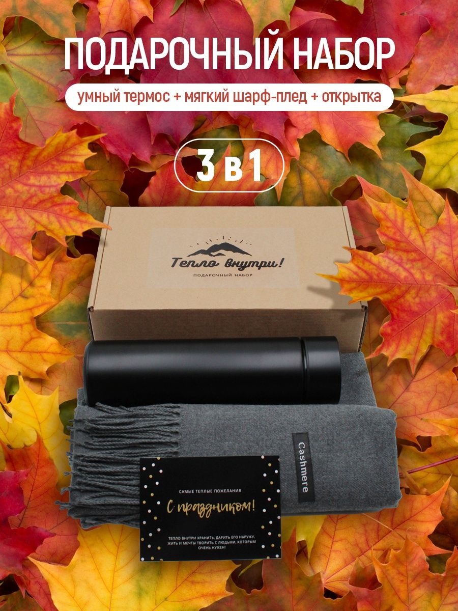 Элегантный и стильный подарочный бокс набор 3 в 1 "Тепло внутри": умный термос с датчиком температуры, всесезонный шарф-плед и открытка. Умный термос оснащен металлическим ситечком, в котором можно заваривать чай или кофе и крышкой с led-дисплеем, который показывает температуру жидкости в колбе. Умная кружка с термометром сделана из высококачественной нержавеющей стали герметична и отлично держит тепло.